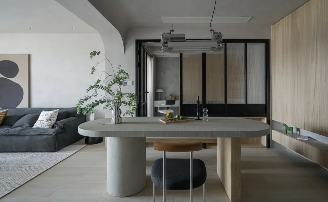 這套新房南北通透,客廳跟陽臺都有獨立的陽臺,能保證室內的采光還有通風。餐廳的空間不大,如果要布置家具的話,菱形的餐桌會是首選。在左邊靠近廚房的墻面,打造了一個嵌入式的柜子,能增加收納的空間,中間預留的地方可以用來放裝飾品,也能用來放平時常用的東西。